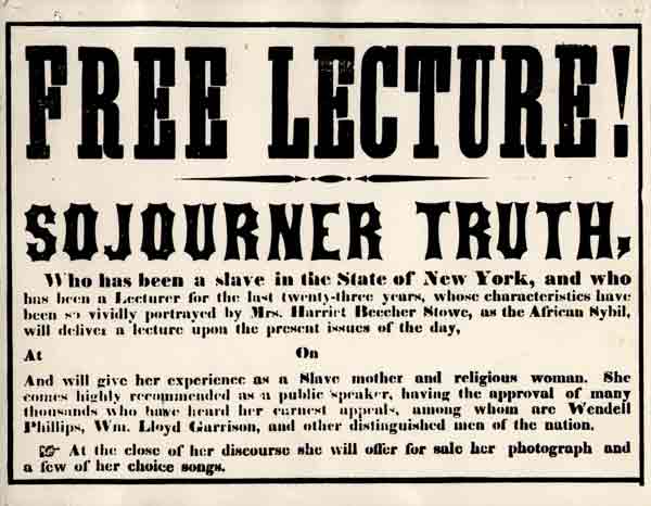 On June 1, 1843, Truth changed her name to Sojourner Truth and told her friends, “The Spirit calls me, and I must go.” She became a Methodist, and left to make her way traveling and preaching about the abolition of slavery. In 1844, she joined the Northampton Association of Education and Industry in Northampton, Massachusetts. Founded by abolitionists, the organization supported women’s rights and religious tolerance as well as pacifism. There were 210 members and they lived on 500 acres (2.0 km2), raising livestock, running a sawmill, a gristmill, and a silk factory. While there, Truth met William Lloyd Garrison, Frederick Douglass, and David Ruggles. In 1846, the group disbanded, unable to support itself. In 1847, she went to work as a housekeeper for George Benson, the brother-in-law of William Lloyd Garrison. In 1849, she visited John Dumont before he moved west.